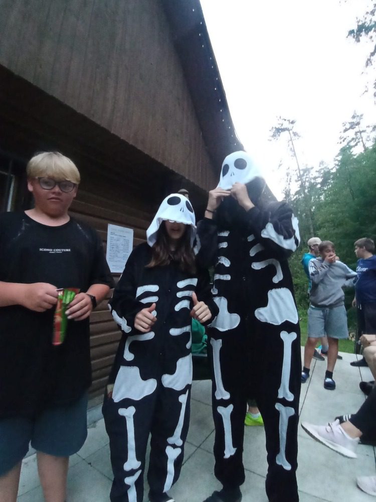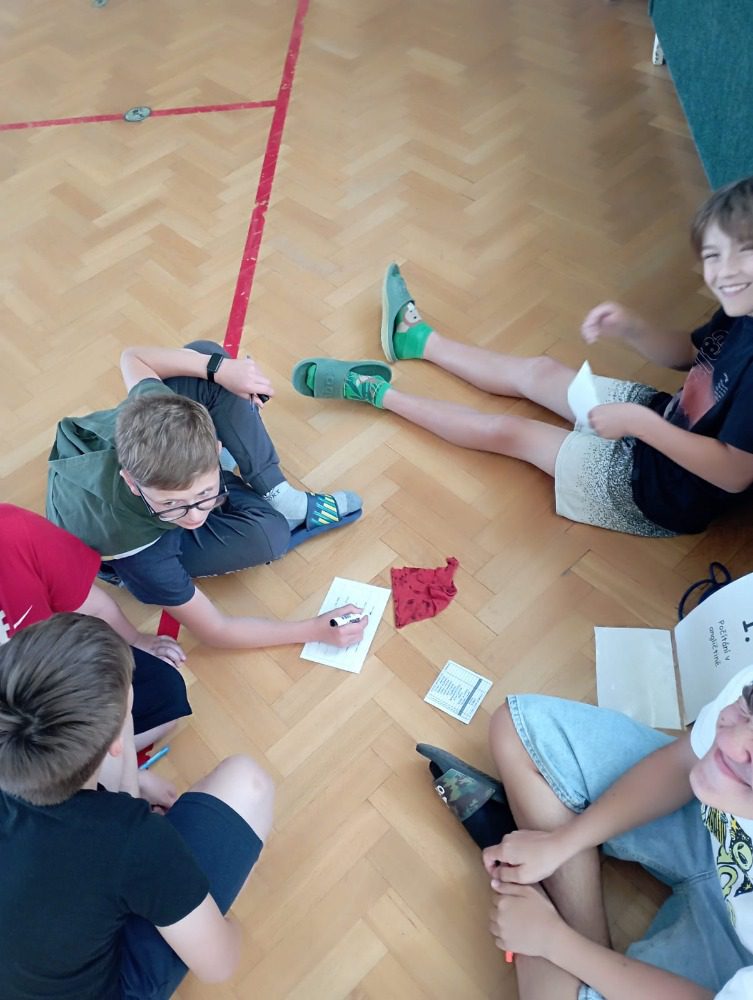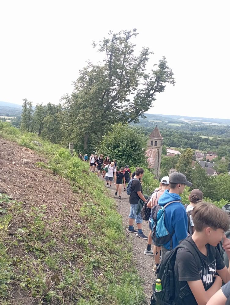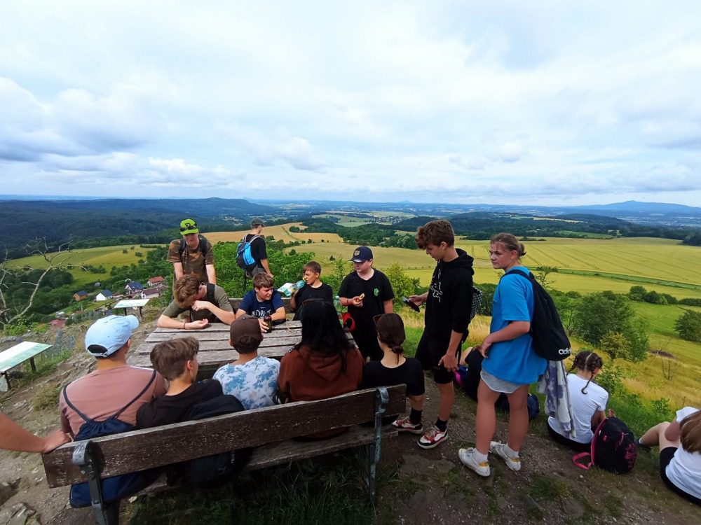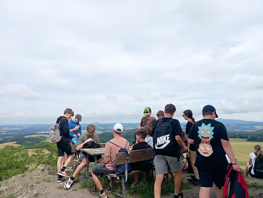 Ve středu nás čekal „třídeňák“. V 7:40 jsme se sešli na nádraží v Dolním Bousově, odtud jsme vyjeli do nedalekých Malechovic. Z Malechovic jsme došli na Nebákov, z Nebákova do Křenovského šenku, tam jsme objevili pole s hráškem, někteří si udělali zásobu na horší časy a hrášek tak jedli i v pátek 😊 Cesta dále pokračovala přes Troskovice na Vidlák, zde bohužel bylo zavřeno a tak nás čekala cesta až na Hrubou Skálu, zde byla hodinu a půl dlouhá pauza, kterou většina využila k objednání hranolek, smažáku, zmrzliny … Po naplnění bříšek jsme vyrazili podél starého hřbitova dolů na Želejovskou louku, k Věžáku a potom do Čertoryjí. Došlo na rozdělení chatek a po přivezení baťohů (děkujeme paní Zímové) se začalo vybalovat. Kemp už je starší, ale stačilo to. První večer jsme si opékali buřtíky. Jelikož nebyl v kempu silný signál, většina trávila hovorem se spolužáky, paní učitelkou a paní asistentkou, opravdu jsme se smáli od ucha k uchu, co všechno byli někteří schopni vymyslet. Pomocný dozor pomohl zajistit dcera paní učitelky Koubové, za co jí moc děkujeme. Ráno byl budíček o půl 8 a v osm hodin byla snídaně. Po snídani jsme se vydali na cestu na Vyskeř, někteří mírně protestovali, ještě asi cítili předchozí km, ale kupodivu po výšlapu na Vyskeř nikdo nechtěl dolů. Signál mobilu se opět objevil a hráčská duše zaplesala, prosili jsme ať můžeme zůstat, že oželíme i oběd, hlavně že budeme moci hrát. K obědu jsme měli bramborové knedlíky a luxusní gulášovku.