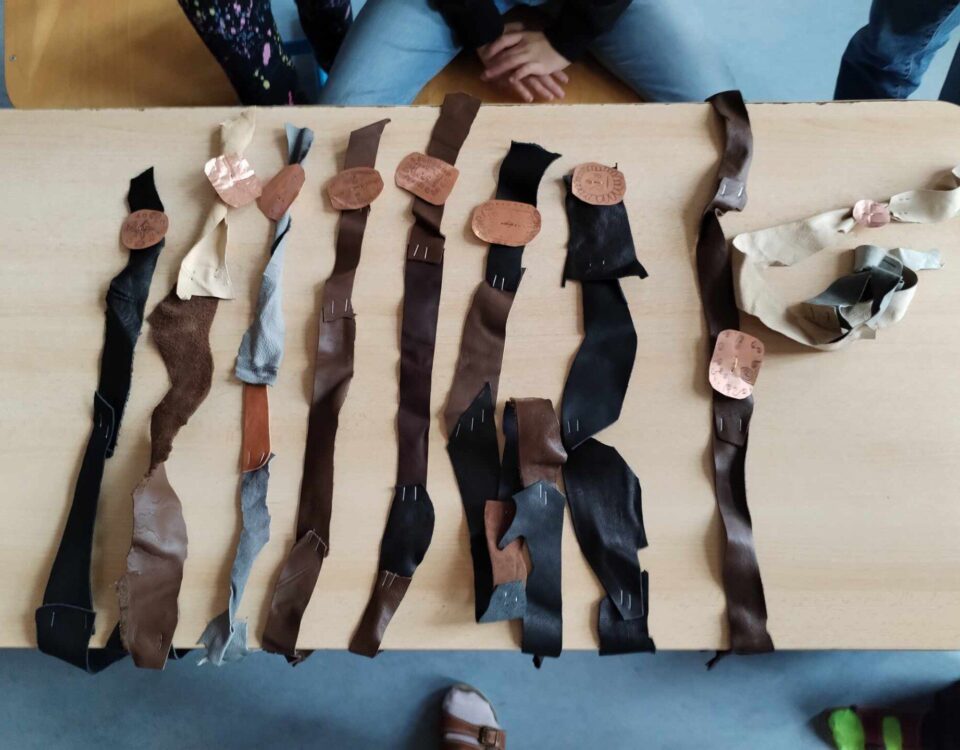 Žáci ze 4.A si při pracovních činnostech vyzkoušeli, jaké to je, vyrobit si z kousků kůže vlastní opasek. Další týden si k němu vyrobili ještě měděnou...